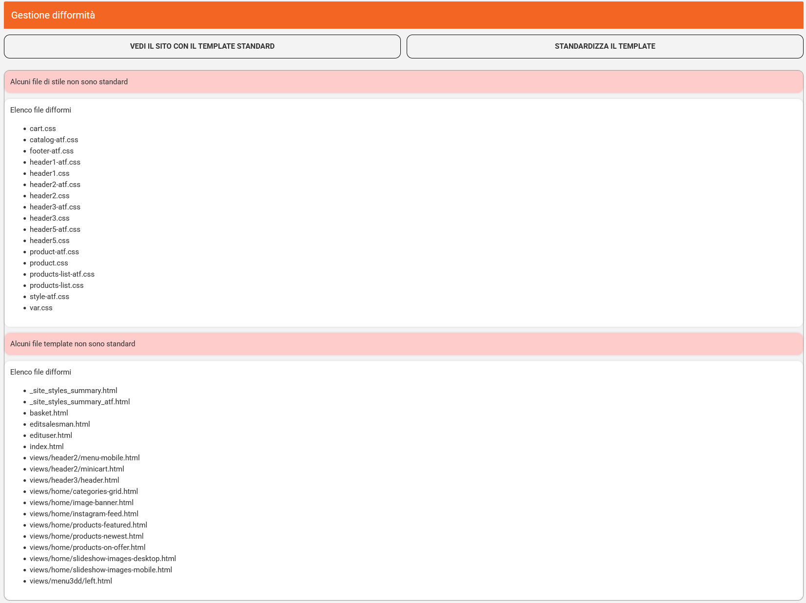 Accedendo al menu per la gestione delle difformità il sistema confronterà i file del template del tuo e-shop con quelli presenti nel repository standard della piattaforma e potranno esserci due scenari:
