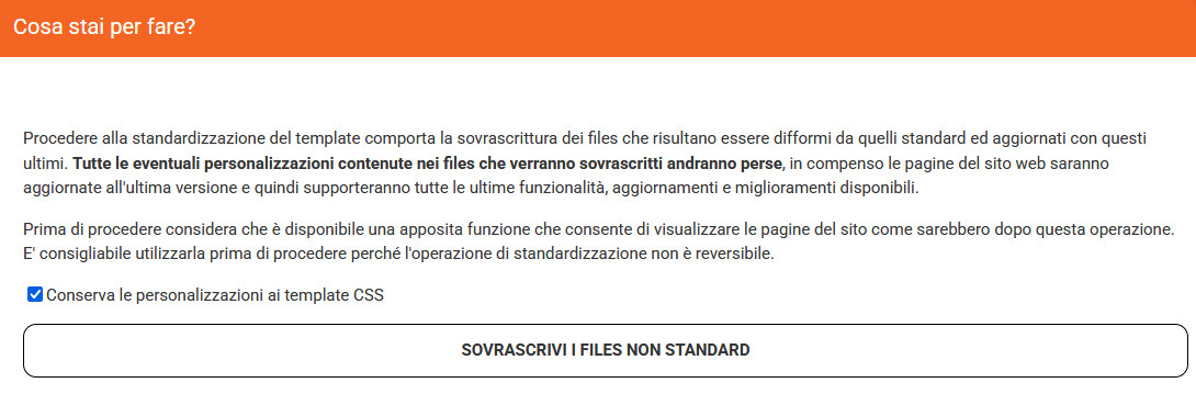 Durante la standardizzazione è disponibile l’opzione: "Conserva le personalizzazioni ai template CSS". Questa opzione è attiva di default e consente di aggiornare i file del template alla versione standard e mantenere le personalizzazioni CSS esistenti.